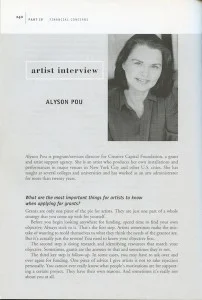 The following is a five page interview with Alyson Pou about financial concerns and fund-raising for artists. It is included in “The Practical Handbook for the Emerging Artist” by Margaret R. Lazzari
